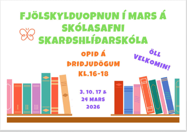 Boðið verður upp á viðbótaropnun á skólabókasafni Skarðshlíðarskóla milli kl. 16 og 18 á þriðjudögum í mars, fram að páskafríi. Foreldrar, forráðamenn og aðrir aðstandendur eru velkomin á safnið með nemendum til að eiga notalega stund og velja bækur. Markmiðið er að efla lestrarmenningu og hjálpa börnum og foreldrum að velja bækur sem hæfa áhuga, styrkleika og hæfni barnanna. Hlökkum til að sjá ykkur! Deila Tísta
