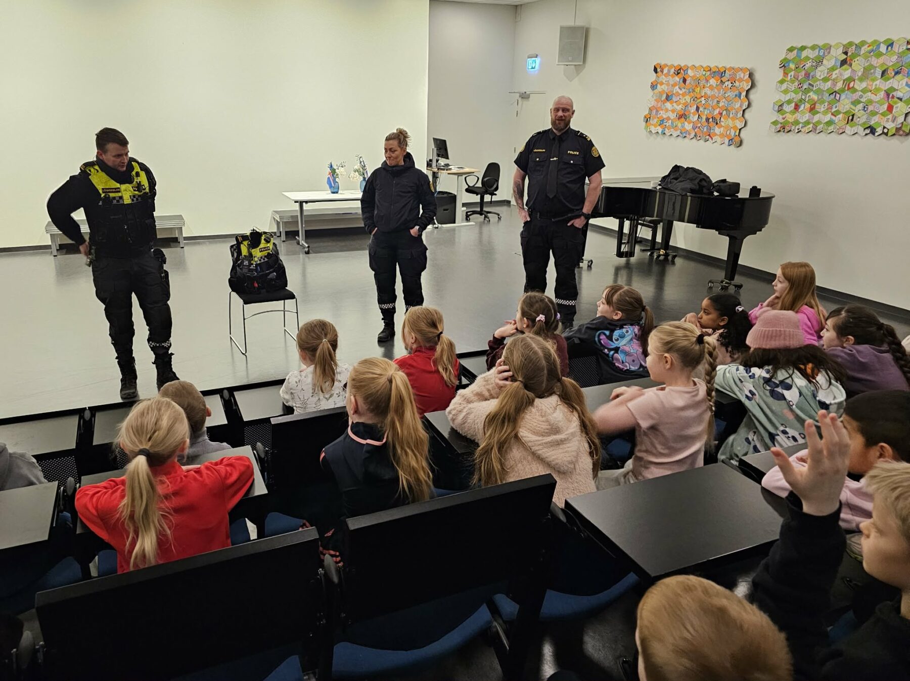 3.bekkur fékk heimsókn frá Samfélagslögreglunni í dag. Nemendur fengu fróðlega kynningu á starfi lögreglunnar. Lögreglan sýndu þeim ýmsan búnað sem þau nota í starfi sínu og fóru sérstaklega yfir lögregluvestið sitt. Á vestinu var margt forvitnilegt að sjá, meðal annars vasaljós og myndavélabúnaður. Krakkarnir voru afar áhugasöm og spurðu mikið út í vestið og búnaðinn, til dæmis hvort vestið væri þungt, sem það er. Þau fengu einnig tækifæri til að halda á handjárnum, sem vakti mikla lukku. Löggan ræddi við nemendur um hvað lögreglan gerir, mismunandi störf hennar og mikilvægi reglna í samfélaginu. Sérstök áhersla var lögð á öryggi á netinu. Nemendur voru meðal annars spurðir út í hvaða efni þau væru að skoða á netinu, hvaða öpp þau þekktu og hvort þau væru að nota þau. Einnig var rætt um hvort þau ættu síma og þá hvort um væri að ræða snjallsíma (skjásíma) eða takkasíma. Þá var þau spurð út í samskipti á netinu, til dæmis hvort þau væru að ræða við ókunnuga í gegnum leiki eða aðeins við vini. Lögð var áhersla á mikilvægi þess að fara varlega, passa vel hverja þau tala við á netinu og að segja alltaf fullorðnum frá því ef eitthvað óþægilegt, skrítið eða óviðeigandi kemur upp. Krakkarnir stóðu sig ótrúlega vel. Þau voru með áhugaverða spurningar, hlustuð vel og sýndu þeim og hvort öðrum virðingu. Heimsókninn lauk með því að nemendur fengu gefins endurskinsmerki til að sjást vel í myrkrinu sem er þessa dagana Við þökkum Samfélagslöggunni kærlega fyrir heimsóknina Deila Tísta
